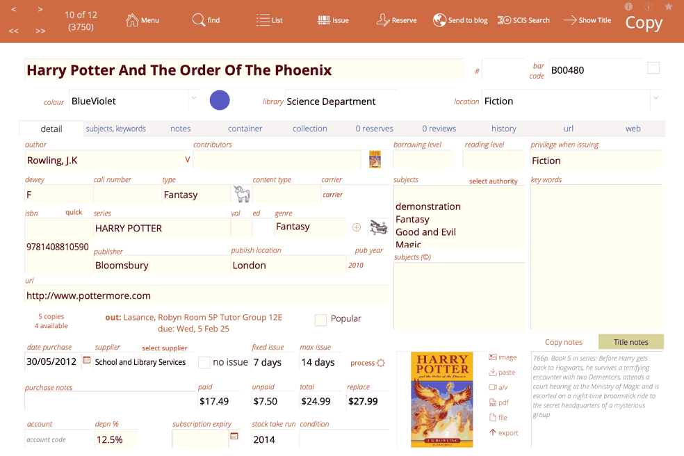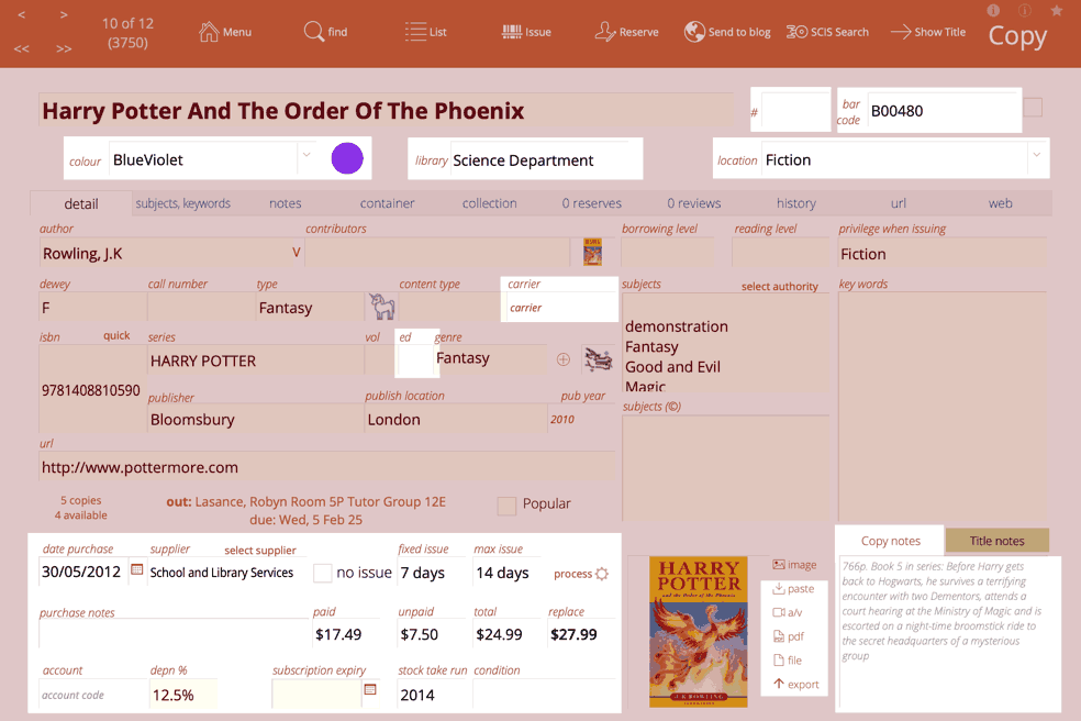 The catalogue consists of titles and copies. For example, you may have 7 copies of the 1 title "Harry Potter And The Order Of The Phoenix". The library administrator can also catalogue information, such as relevant web links and keep no copies.